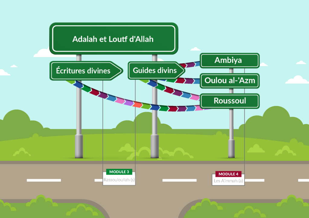 Nous ayant créés, Allah continue de nous entretenir et de nous guider. Ce module traite du loutf et de l’adalah d’Allah. Il traite aussi de la guidance Divine par le biais du noubouwwah. En partant de la création des êtres humains sur terre, il se concentre sur les anciennes nations et les premiers Prophètes, en particulier les Prophètes Oulou al-Azm et les défis qu’ils durent relever, les leçons que nous pouvons tirer de leur histoire et les valeurs universelles qui découlent de leurs enseignements. Les Livres Divins qui furent révélés aux Prophètes élus sont aussi abordés, et en particulier, la dernière révélation, le Qour’an.