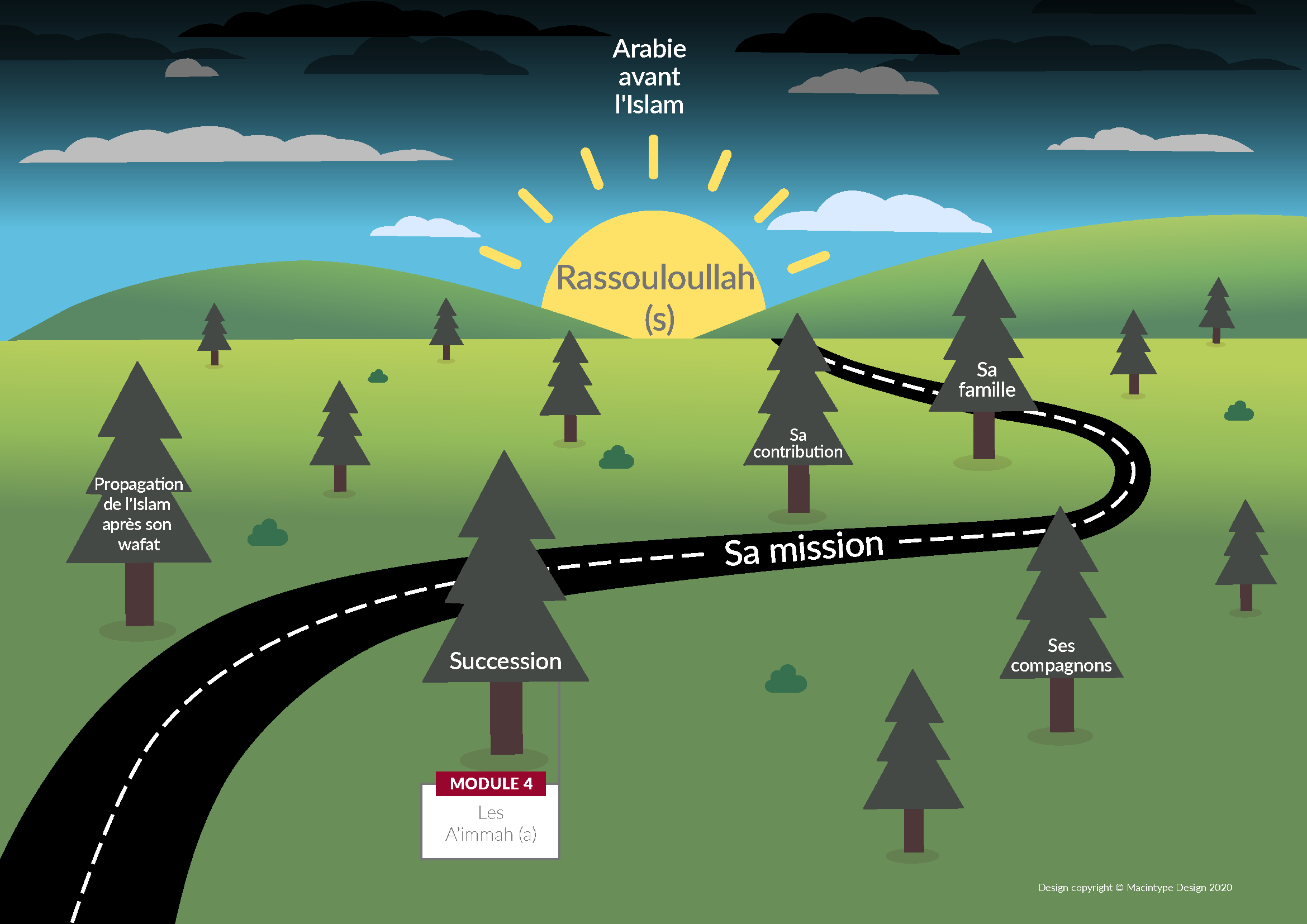 Ce module est dans la continuité du concept de Guidance Divine, mais il se focalise sur les moyens utilisés par le Prophète de l’Islam pour transmettre Son Message et pour vivre en fonction de celui-ci. Il comprend une analyse de sa vie, sa sirah et sa sounnah, sa famille, y compris les dames Khadijah (a) et Fatimah (a), ainsi que ses compagnons. Il traite de la manière dont le Prophète affronta avec succès les défis qui se présentaient à lui et comment il posa les fondations pour l’expansion de l’Islam à l’intérieur mais aussi au-delà de l’Arabie. Le module analyse aussi une série d’étapes qu’il entreprit pour nommer son successeur afin de s’assurer de la continuité de son Message. Ce module affirme sa remarquable contribution à toute l’humanité.